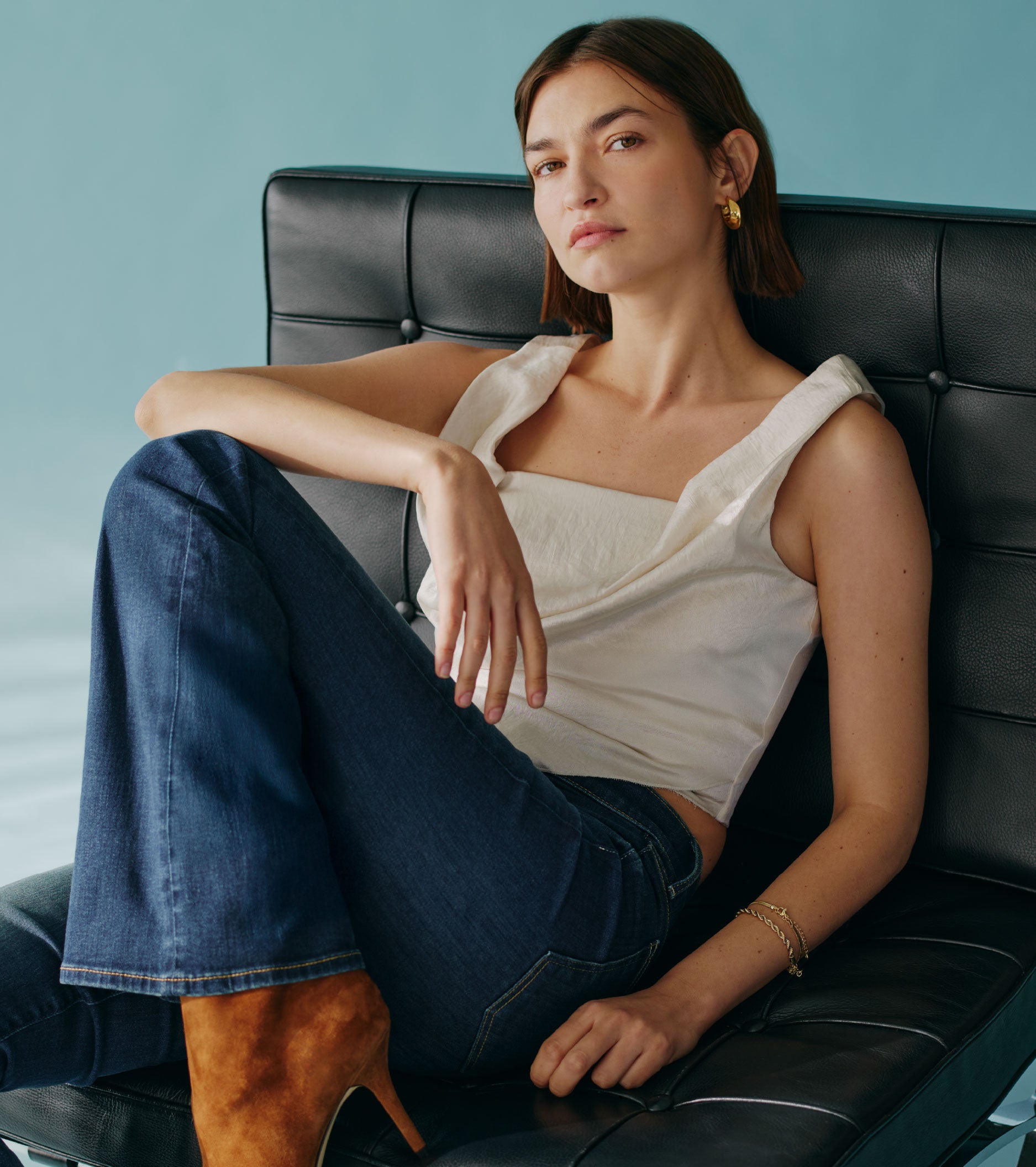 | LENGTH (INCH) | A full floor length, mid-to-high rise jean with a relaxed wide leg silhouette. | A full floor length, mid-to-high rise jean with a feminine wide-leg silhouette. | A full floor length, mid-rise classic bootcut jean. Fitted through the waist and thigh with a subtle flare. | An ankle-length, mid-rise jean with a timeless slim-straight silhouette. | A cropped, ankle length, high rise jean with a feminine wide-leg silhouette. |